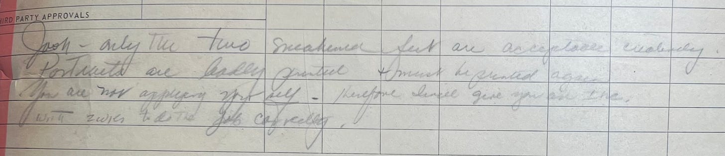 “Josh, only the two sneakered feet are acceptable creatively. Portraits are badly printed & must be printed again. Your are not applying yourself - therefore I will give you an Inc. with 2wks to do the job carefully.”